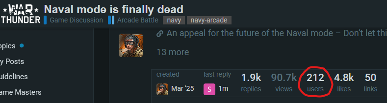That thread is minuscule, super tiny 🤏 With Naval already being a smaller community, every effort should be made to involve as many naval players as possible. And this thread is by far the largest and most active naval thread there is. And it is specifically about ALL issues that are negatively affecting Naval Battles.