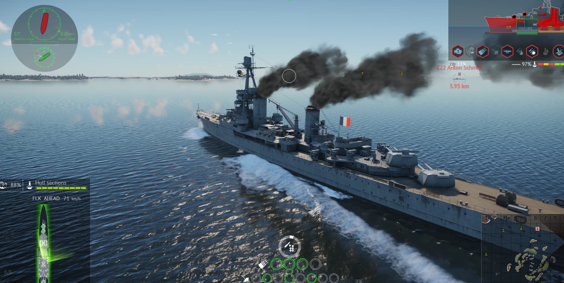 Gunfire audio sounds way better than it did before with more reverb. Wake now follows the bow of the ship more realistically. Hull sections for you and your target are highlighted clearly.