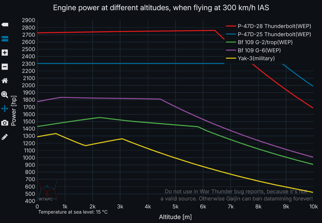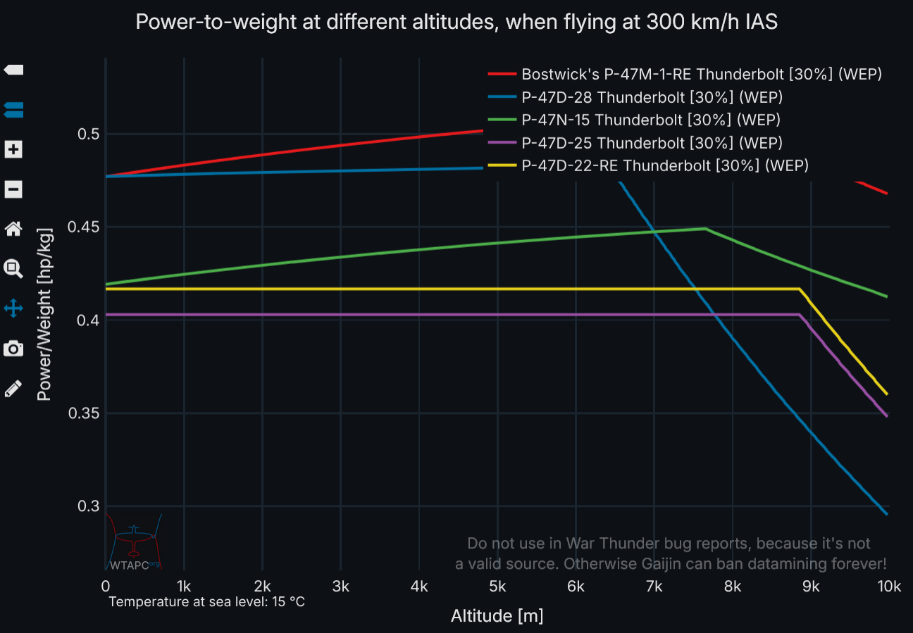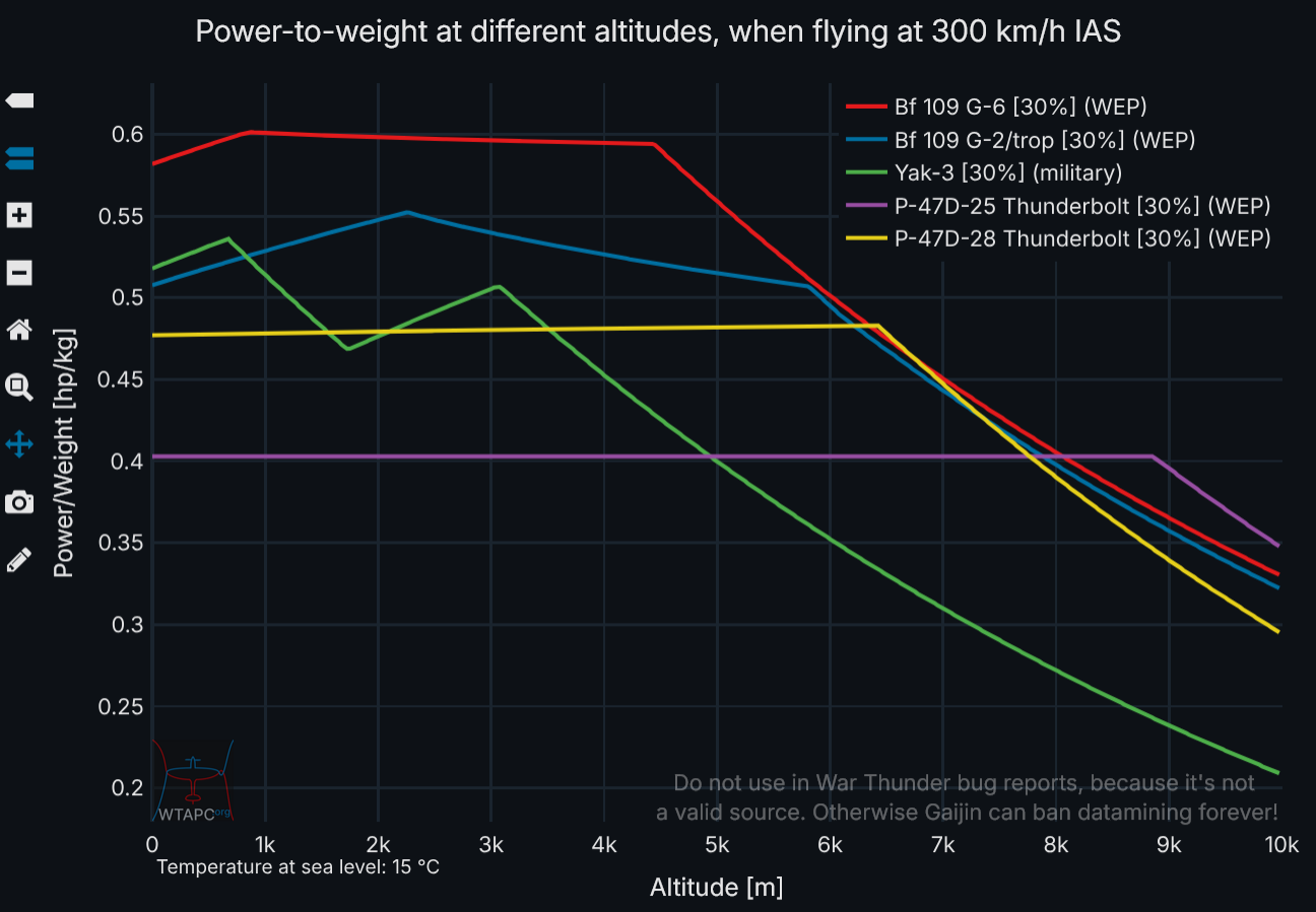 This is from War Thunder Aircraft Performance Calculator. You can see that the Thunderbolts are truly high altitude fighters. They make power in a way that is unusual… basically a straight line across as altitude increases (until they get waaaaay up there).