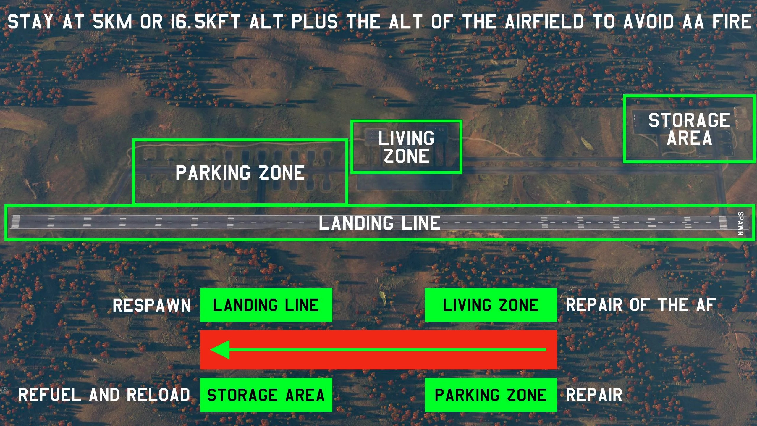 So for ww2 should be: runway (I guess you know what it is), hangars (left bottom), tents (right bottom), and fuel depot (north of the hangars)