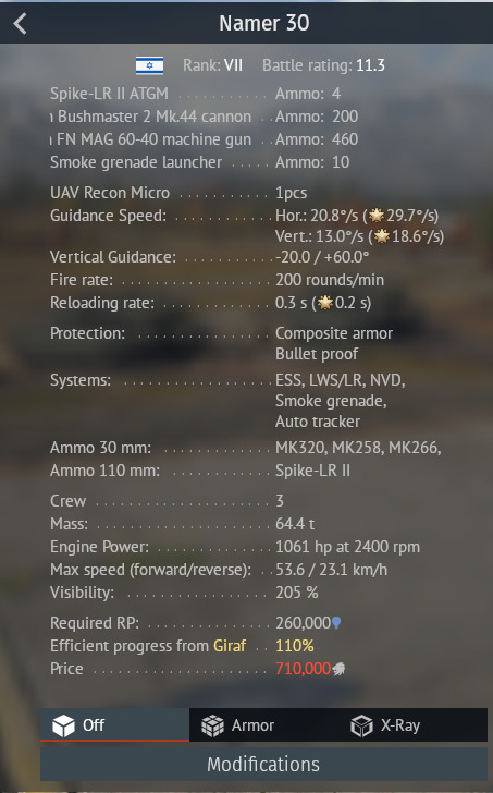 The Namer is armed with a Samson Remote Controlled Weapon Station (RCWS). This system can be configured with either a .50 calibre M2 Browning Heavy Machinegun or an Mk 19 Automatic Grenade Launcher. The vehicle is also armed with a 7.62 mm FN MAG machine gun and a 60 mm mortar tube. An IFV version of the vehicle is under development which is armed with a 30 mm autocannon mounted in an unmanned turret. The vehicles are also under evaluation for being armed with a Spike ATGM.