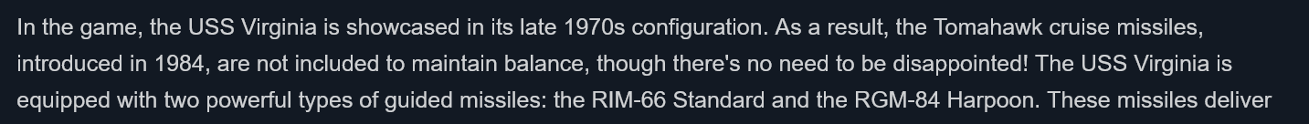 In addition to the UGM-109E Block IV for HMS Astute, they also added the RGM-109B TASM - there are no ships in the game that can use it currently, and it was mentioned in last year 's devblog for USS Virginia ( that it wouldn’t have them )
