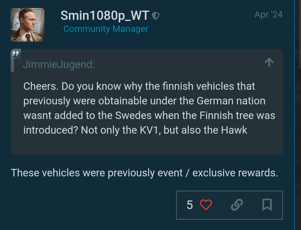 Sorry for the ping again but given your prior comment, Finland and Sweden in general doesn’t have a equivalent vehicle to fill the 4.3 hole that the KV filled and the KV-1A at 4.7 is not an equivalent exchange so why can’t they get something to fill that hole?