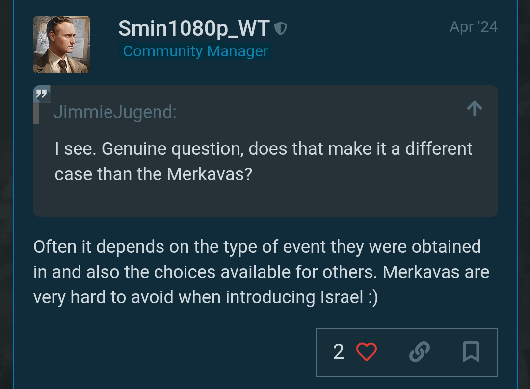So are you saying that all of this could change the devs minds? Cause tbf it seems like more people would like the same treatment as the Israeli Merkava.