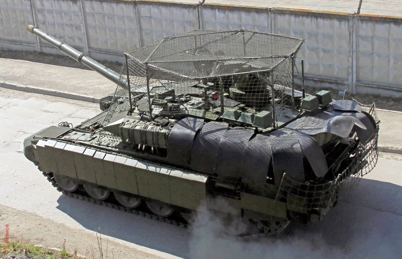T-72 2025 with a Bunch of Cages, fences and rusty add on armor field mods