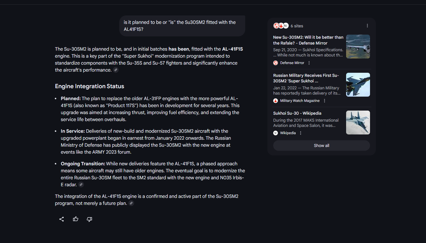 I think there are Su30SM2 with the the AL41F1S…all of them no, some of them Yes! Yeah Yeah I know AI…there are articles about it though!