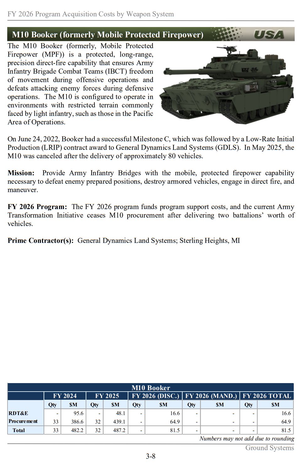’ 80x M10 combat vehicles have already been delivered but are still expected to receive funding in FY 2026 for program support, covering sustainment and maintenance for two battalions.