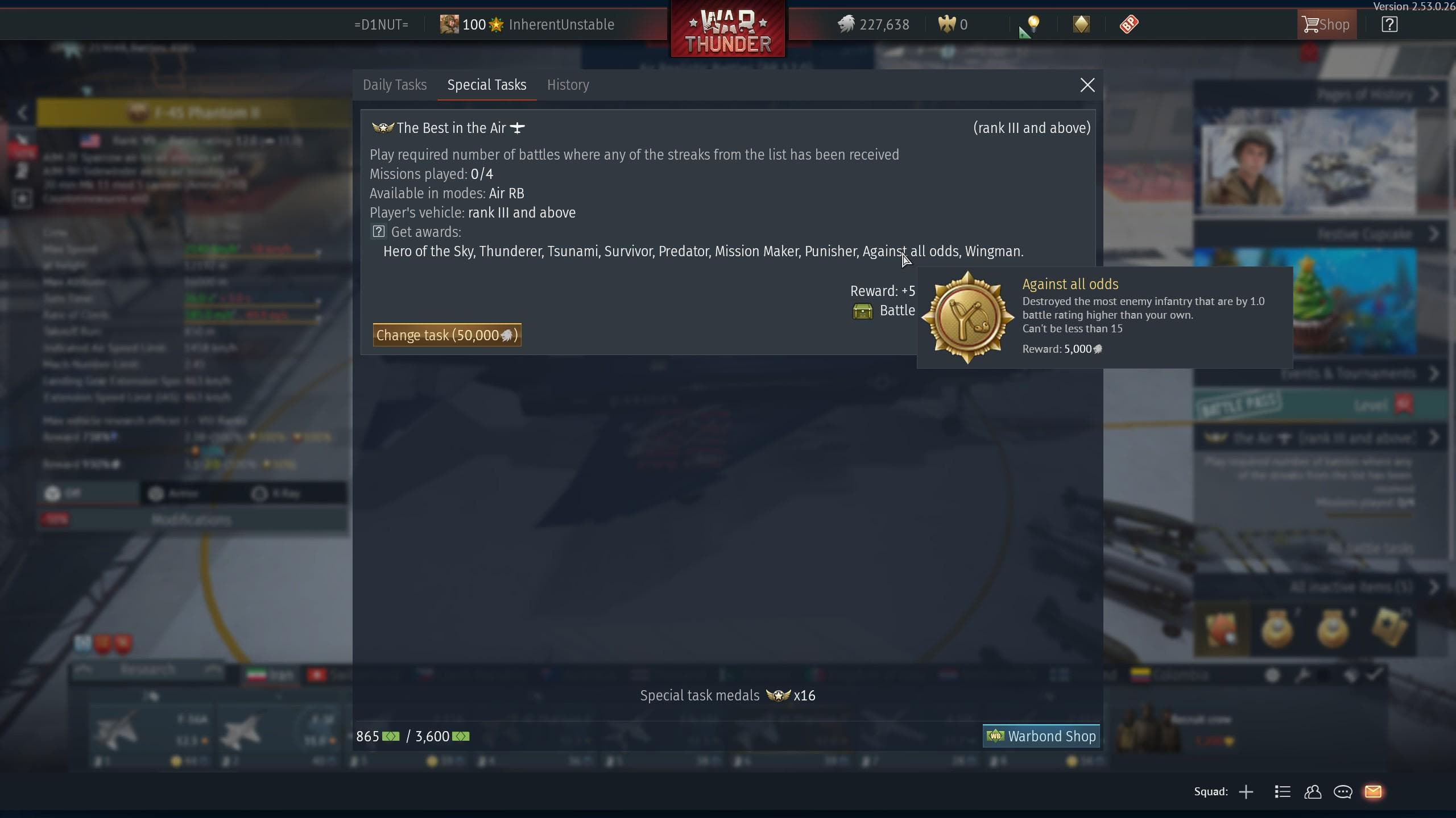 “Against all odds” “Destroyed the most enemy infantry that are by 1.0 battle rating higher than your own.”