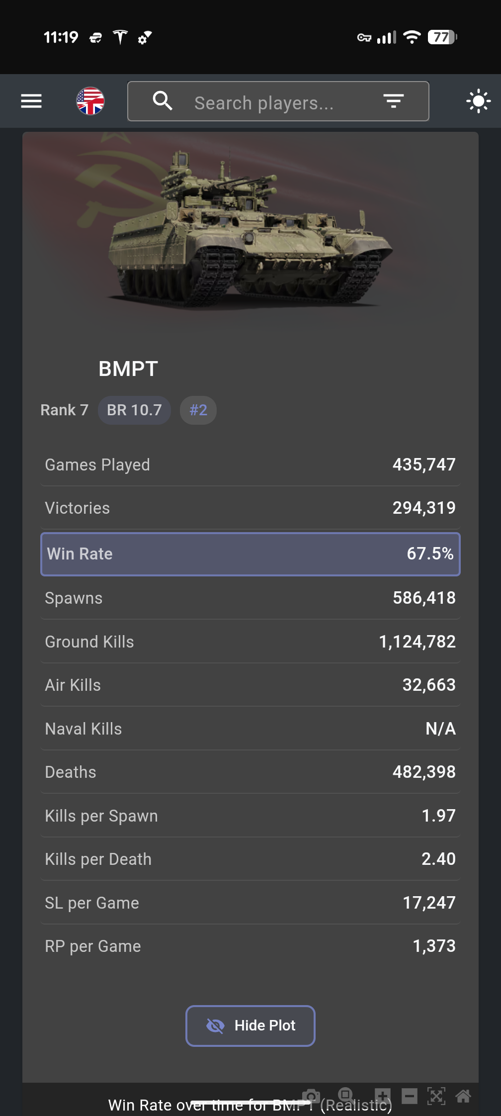 I saw this stat line yesterday, utter insanity it hasn’t had an emergency BR change to 12.0 already. It’s completely ruined the 9.7-11.7 BR range of all tech trees. I’ve also seen multiple people play it at 12.7 and it performs just fine there, almost more like how other auto cannon and ATGM slingers perform at their respective BRs…