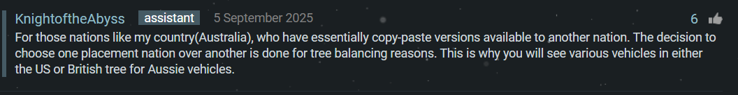 Tankfully the few areas where the Aussie/ANZACs are notable are where Canada needs help. Hence why a combined tree or, at worst, ANZACs being a sub-tree for Canada is looking to be the most feasible idea outside a sub-tree rework.