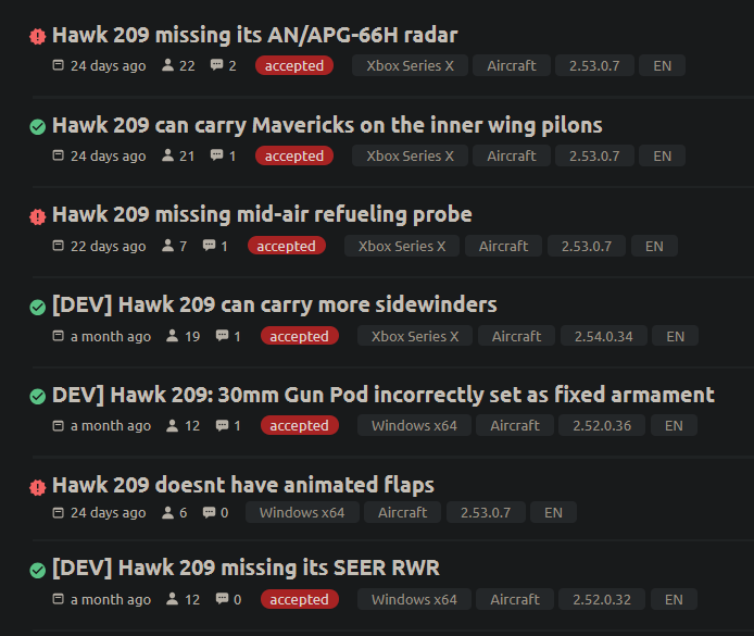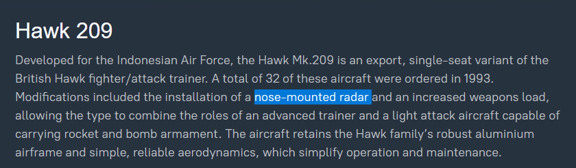 Any updates on the Hawk 209 still missing its radar, updated RWR, additional mavericks, and missiles?