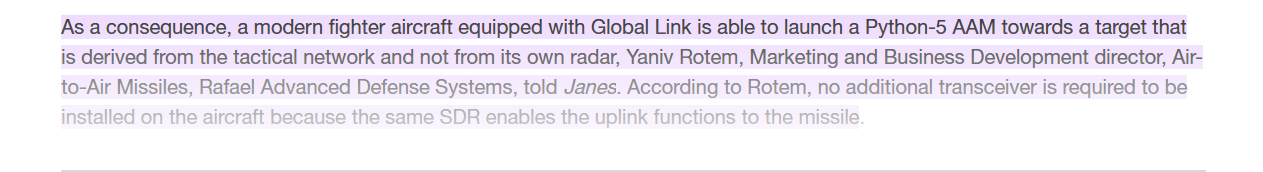 It says here that as a consequence of this upgrade, fighter jets within the tactical network can provide uplink to the missile. Nothing about guiding. And what you stated just is more evidence that it’s talking about fighter to fighter datalink since an additional antenna isn’t required to be installed on the fighter aircraft.