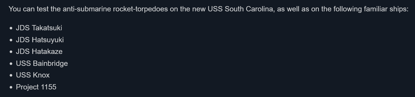 Ships which have an ASROC launcher but did not receive the functionality in this update, the USS Albany (CG-10) and Pr.11352, did not get launch boxes.