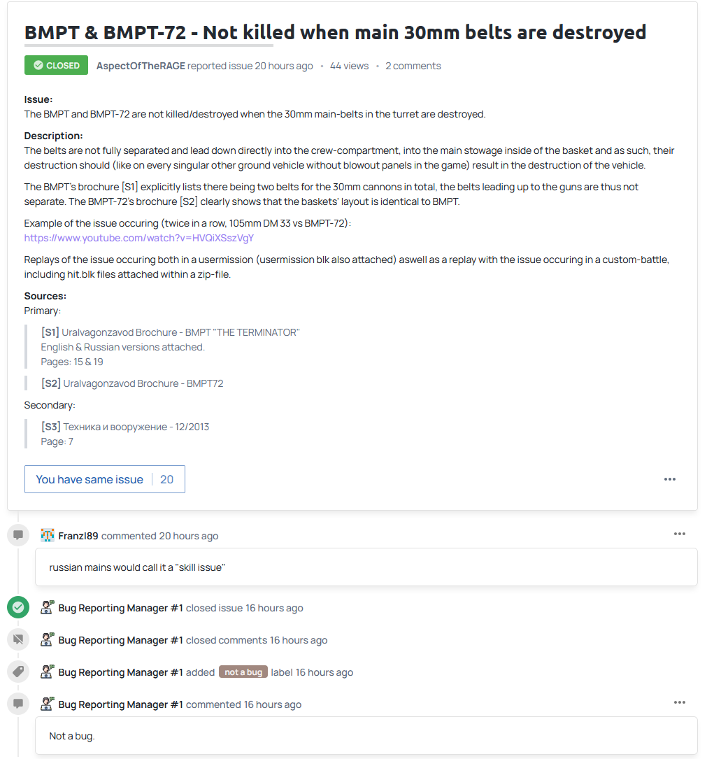Where were the sources for this report? “Change this to be overpowered like the TT one, I am dying too much, I need to seal club in my premium BMPT” - Gets accepted. There are no external belts in the BMP-T, the ammo leads straight down to the autoloader and the crew.