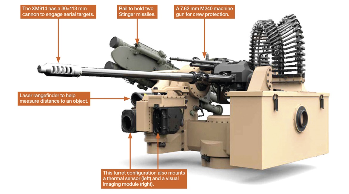 - Phase one is equipped with a 30mm XM914E1 chain gun, coaxial M240C 7.62mm, 4x FIM-92 Stingers, and 2x AGM-114L Hellfire’s.