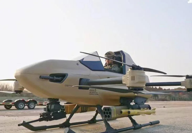 I wonder if there is one a sort of heavy attack FPE drone but its a good human in the loop system where this manned quad copter sits back and provides info and context to the main team. But it does provide areas that cannot support a attack Heli a attack Heli like system. Now every small base has a mini attack Heli with low thermal out put that can destroy a AFV or a advanced team. But in my country farmers have these large drones for farm related roles and parts of this thing look like that drone.