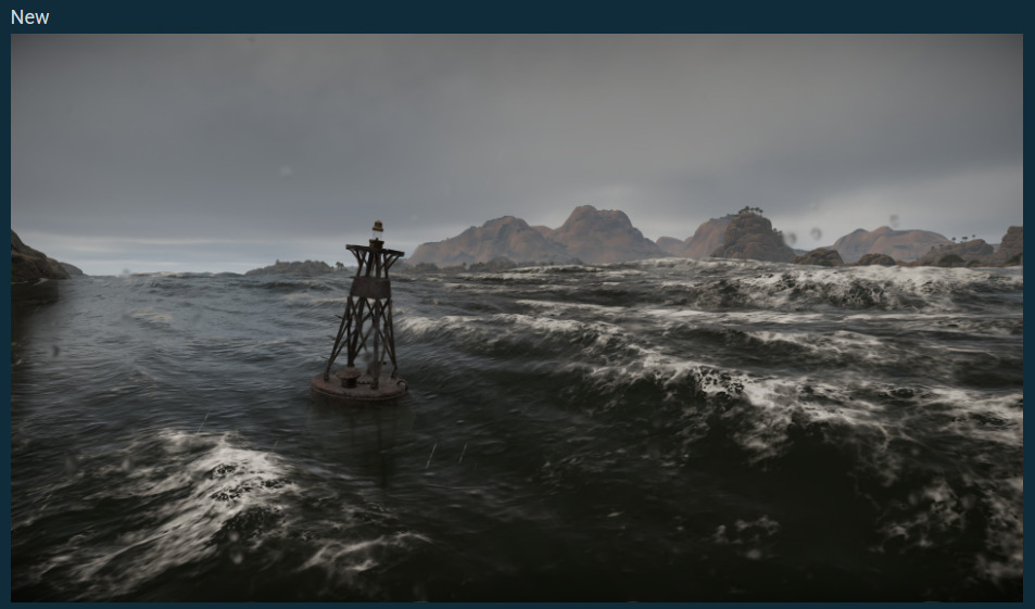 Alongside this, the transparency and blending algorithms have also been reworked, which is especially noticeable when two different elements meet — like when foam particles or splashes overlap opaque objects, such as rocks or ship hulls. New logic for the transparency and render modes has also been developed, these improvements eliminate artifacts that previously distorted reflections at sharp viewing angles. Now the water’s surface maintains clarity and physically accurate brightness even at minimal angles to the camera.