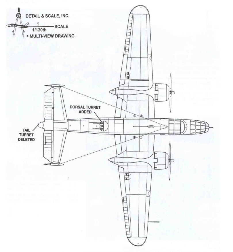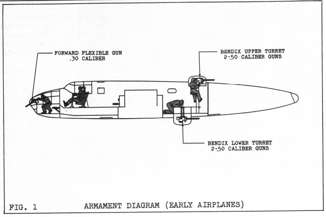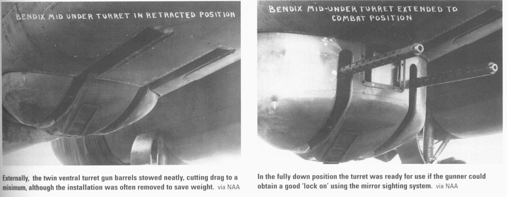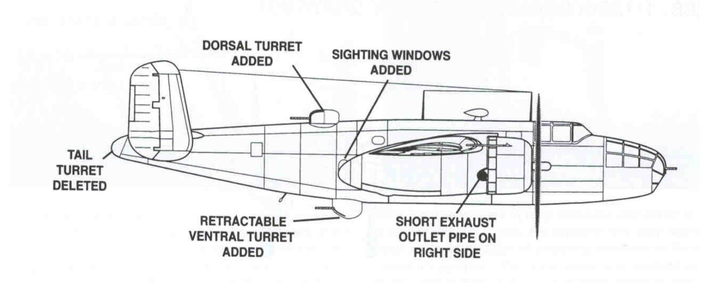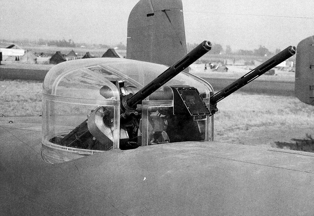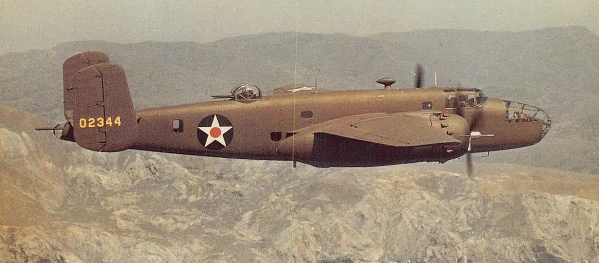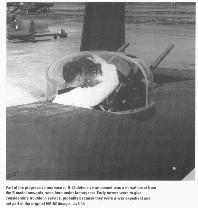 Following the delivery of 40 B-25As in 1941, self-sealing fuel tanks and armor protection became standard features, as directed by combat reports from Europe. However, the US Army soon recognized that the B-25A’s defensive armament, four .30-caliber and one .50-caliber machine gun, was inadequate. To address this, North American removed all the original guns except the one in the bombardier’s nose compartment. The tail cone was shortened by about one foot, retaining a glazed section to serve as a prone observation post. Bendix electrically operated turrets, each armed with twin .50-caliber machine guns, were installed in dorsal and ventral positions. The ventral turret was fully retractable and operated by a gunner kneeling over a periscope sight, using dual hand controls to traverse the guns through a full 360 degrees under electrical power.
