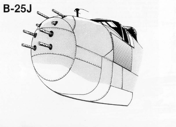 Although originally intended to serve in the medium bomber role, the B-25J became increasingly important as a strafer. By 1944, the cannon-armed G and H variants had proven less effective in combat, as targets suited for the 75 mm gun had become rare. To compensate, large numbers of B-25Js were converted into solid-nose gunships optimized for strafing. Between 800 and 1,000 aircraft were factory-built or modified with a solid nose mounting eight .50 caliber machine guns, raising the total to twelve forward-firing guns. With the solid nose modification, the aircraft was designated as B-25J-11, -17, -22, -27, -32, or -37, depending on which production block the modification took place. Beginning with the B-25J-30-NC production block, underwing racks for up to four 5-inch rockets per wing were also added, further increasing firepower.