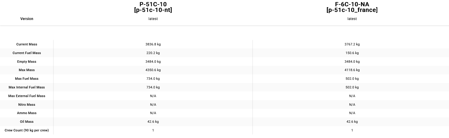 When fuel mass is excluded, both the F-6C and the P-51C-10 have the same weight, so the camera equipment does not negatively affect the F-6C by increasing weight or drag according to StatShark.