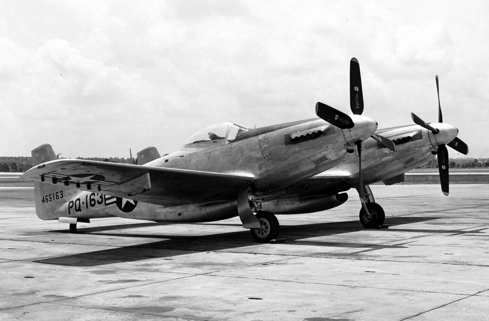 A mockup and wind-tunnel model were completed in early 1944, and after inspection on February 8, North American received a contract to build XP-82 prototypes with Packard-built Merlin V-1650-23/25 engines rated at 1,860 horsepower, as well as two XP-82As fitted with Allison V-1710s. Unlike the P-38 Lightning, the propellers turned inward toward the fuselages. The twin fuselages themselves were adapted from the lightweight XP-51F design. The left cockpit had full instrumentation, while the right had basic instruments but complete flight controls.