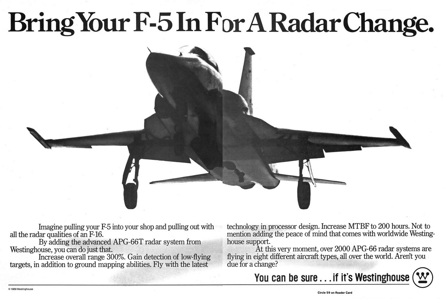 In 1989, Northrop partnered with Westinghouse to market an upgraded F-5 featuring the APG-66T radar, a smaller, lighter variant of the F-16’s APG-66 designed specifically for retrofit installations.