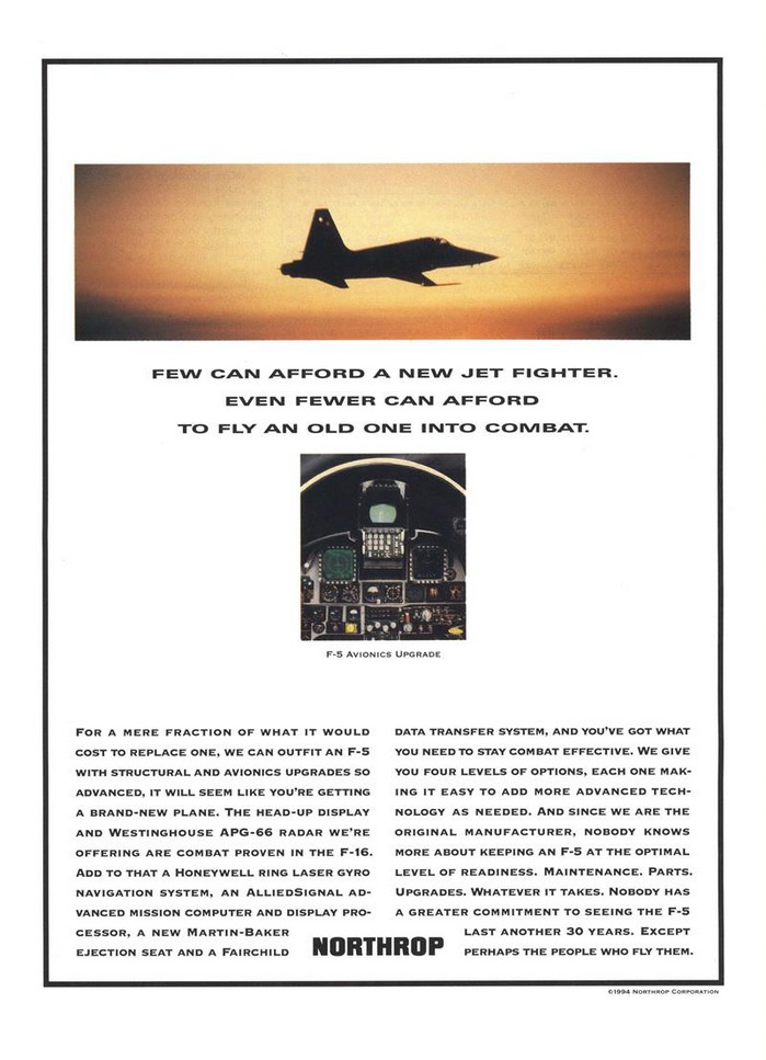 Meanwhile, Northrop had failed to secure production contracts for the F-20A Tigershark and the YF-23. With no major military contracts on the horizon, the company turned its attention toward modernizing the large global F-5 fleet still in service.