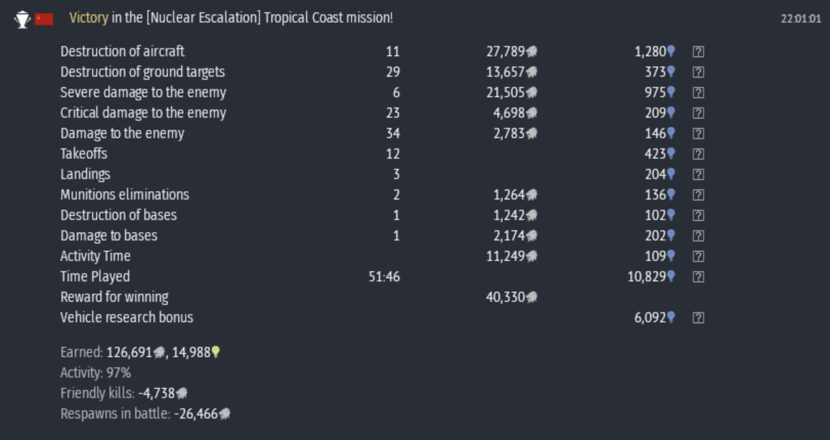 First game after the update today… Felt like we get less score but I am not sure if that change or not. This is top tier USSR (13.0) for the event. No one is trying to get the big nuke anymore just CAS.