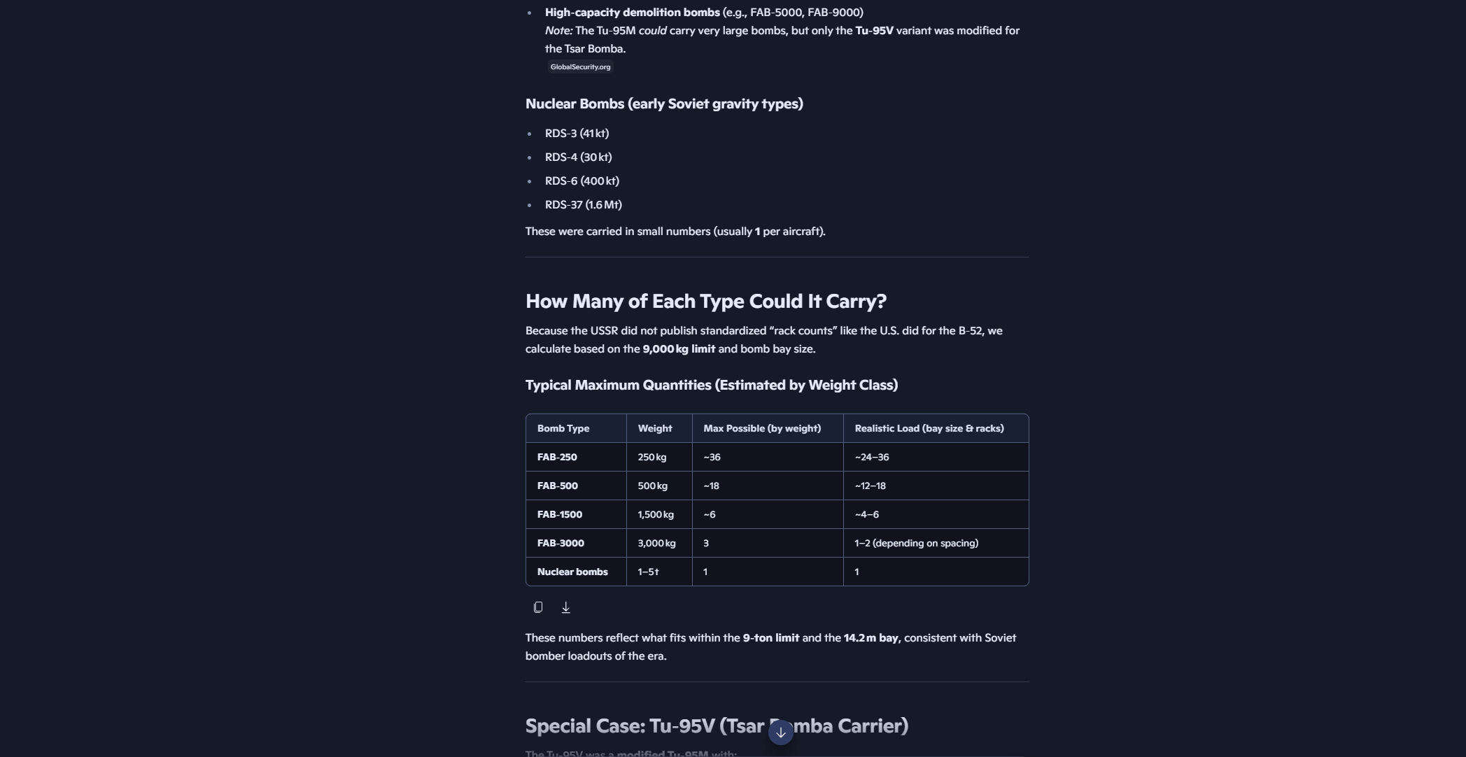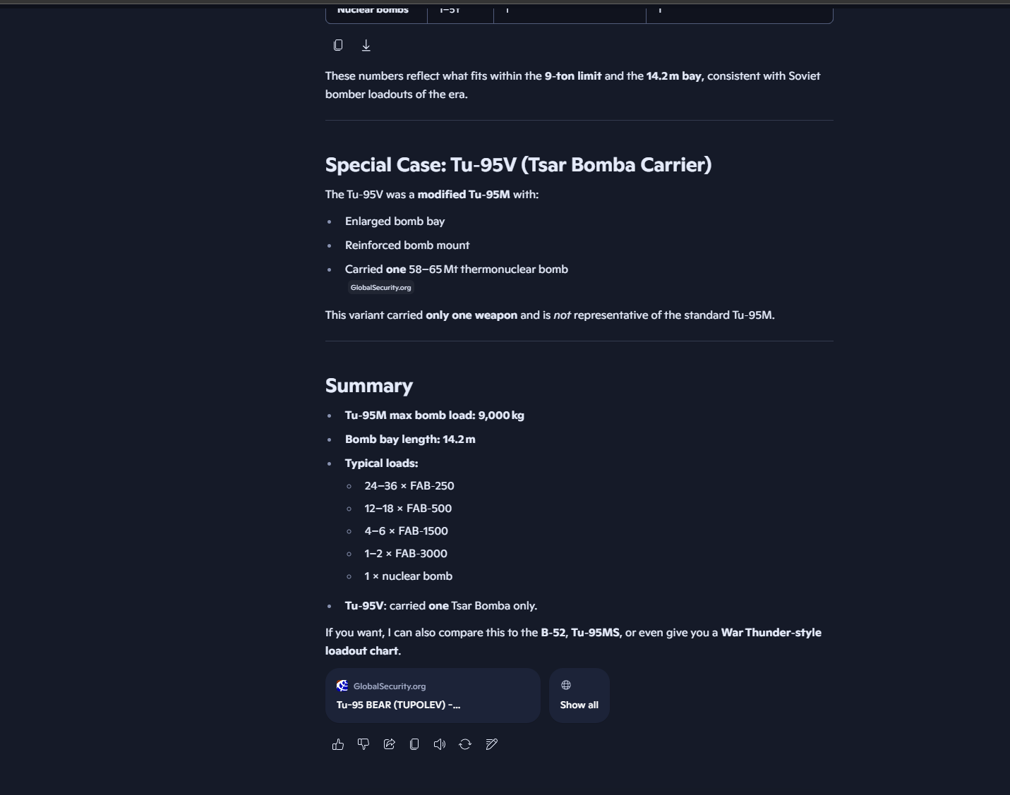 TU95M and TU95MS are now more of a cruise missile launcher platform than a strat bomber, it carries a lot of cruise missiles like KH-101/KH-102, KH-55, and it can carry up to 16, it has pulled away from the area deletion to a flying cruise missile battery