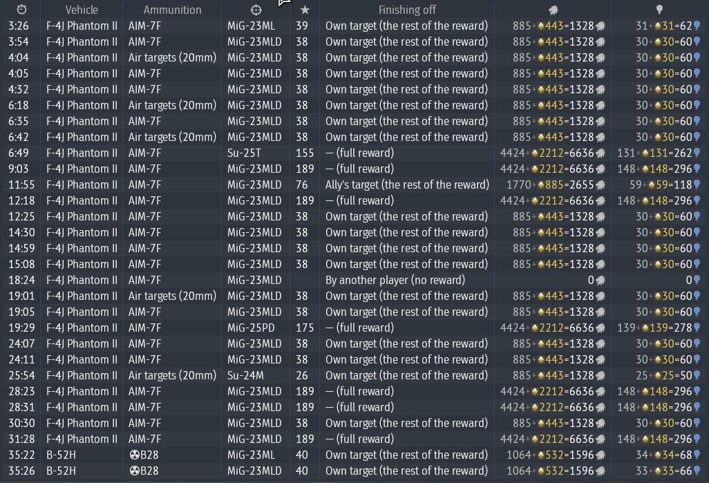 Only thing is: The AIM-7F is so unbelievable easy to defeat. Just do a 180° turn and it lost you. You can’t even reaquire the target as the PD radar of the F-4S/J only works for incoming enemies (HDN). Everything else is invisible to it → No chance to lock on in a chase (except for friendlies for some reason). The AIM-9H you get for this case is flared by a single flare, so no real option there.