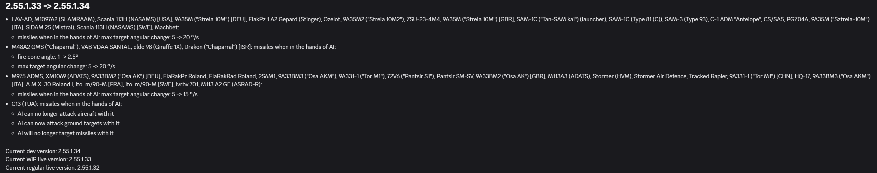 As far as the datamines are concerned, there have been no changes to the AA systems or their AI, and anecdotally, they’re still reacting the same way to my actions as well. Osas still engage between 8.5-9.5km when they have LOS and FlaRak between 5.5-6.5km for example, and they track you the same as they did before.