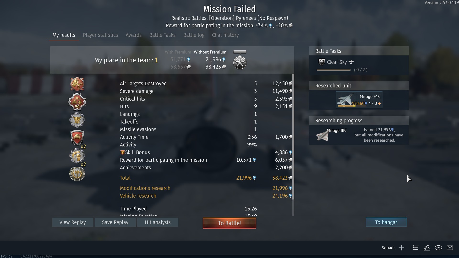 First ace with the Mirage IIIC, the match ended up in a 1v3 and after butchering two guys one by one I ended up being steamrolled by a MiG-21SMT that had a massive energy advantage on me :(