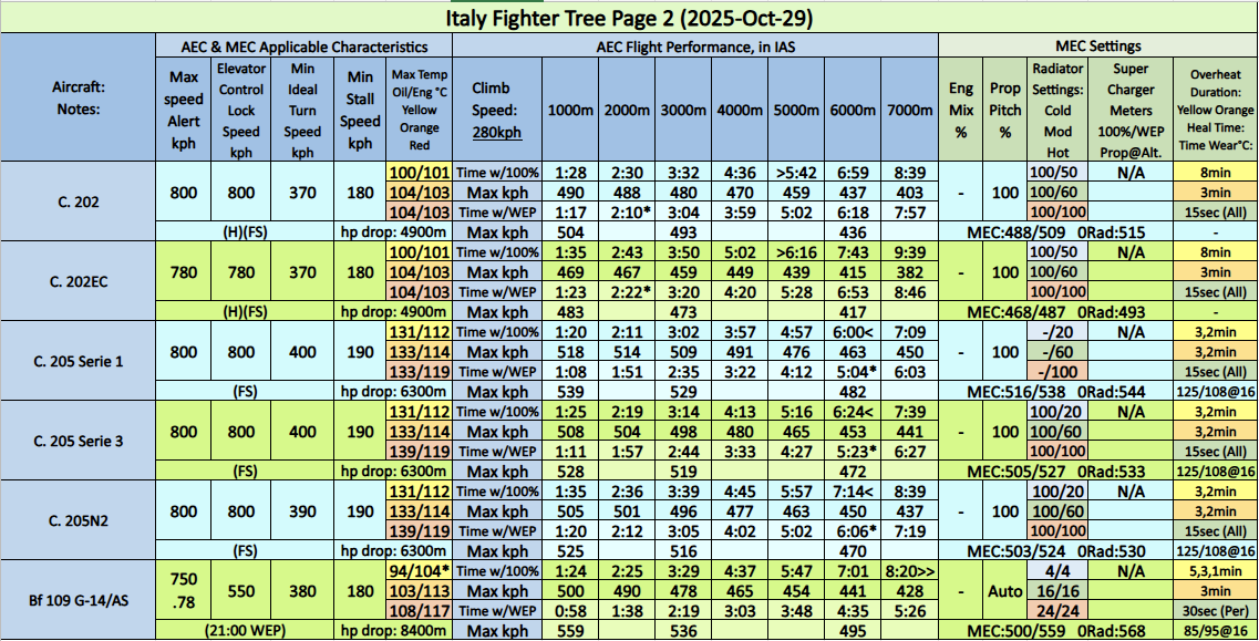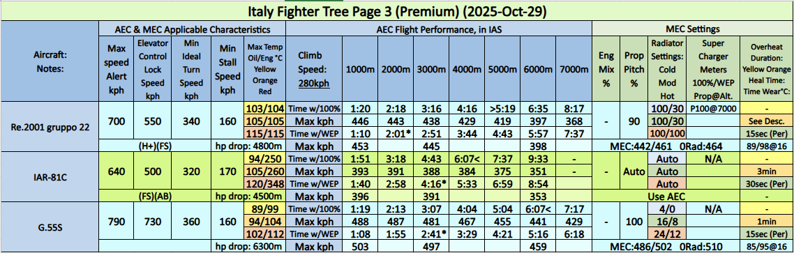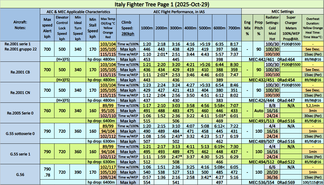 – Re.2001 Serie 1, RE.2001 gruppo 22, Re.2001 CB, RE.2001 CN: These planes benefit from MEC overall. AEC is set incorrectly, it closes to 0% during Throttle100% then opens fully to Rad100/100 using WEP. These planes run notably hotter than others and prop pitch was lowered to Prop90. These planes do not gain additional cooling from high speed, they actually get slightly warmer at high-speed including dives. Fuel: 31min. Engine hp drop: 4800m.