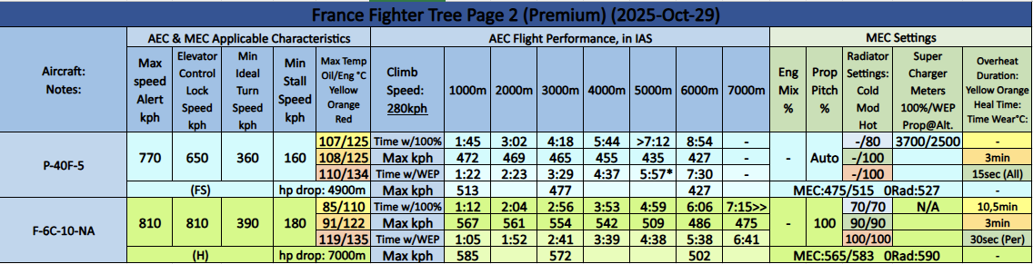 – P-40F-5: This plane benefits from MEC over AEC overall. This plane does not overheat like the P-40E-1. Performance seems identical to P-40F-10. Fuel: 30min. Engine hp drop: 4900m.