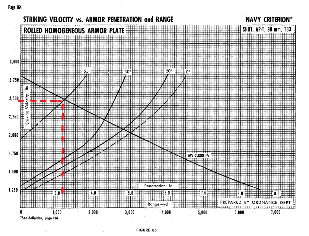 Next, we need to establish a basis for the 1800 K factor. I’ll use 90mm T33, since its a well documented round. The 90mm T33 will defeat the 80mm Panther glacis plate to roughly 1400 yards. This is shown by the following document. The penetration chart below shows the 90mm T33 will pen the 3.15" (80mm) at 55 degree glacis plate to about 2425 feet per second. The chart is based on US navy criterion, so the standard is pretty strict. Its a good basis for the performance of the round.