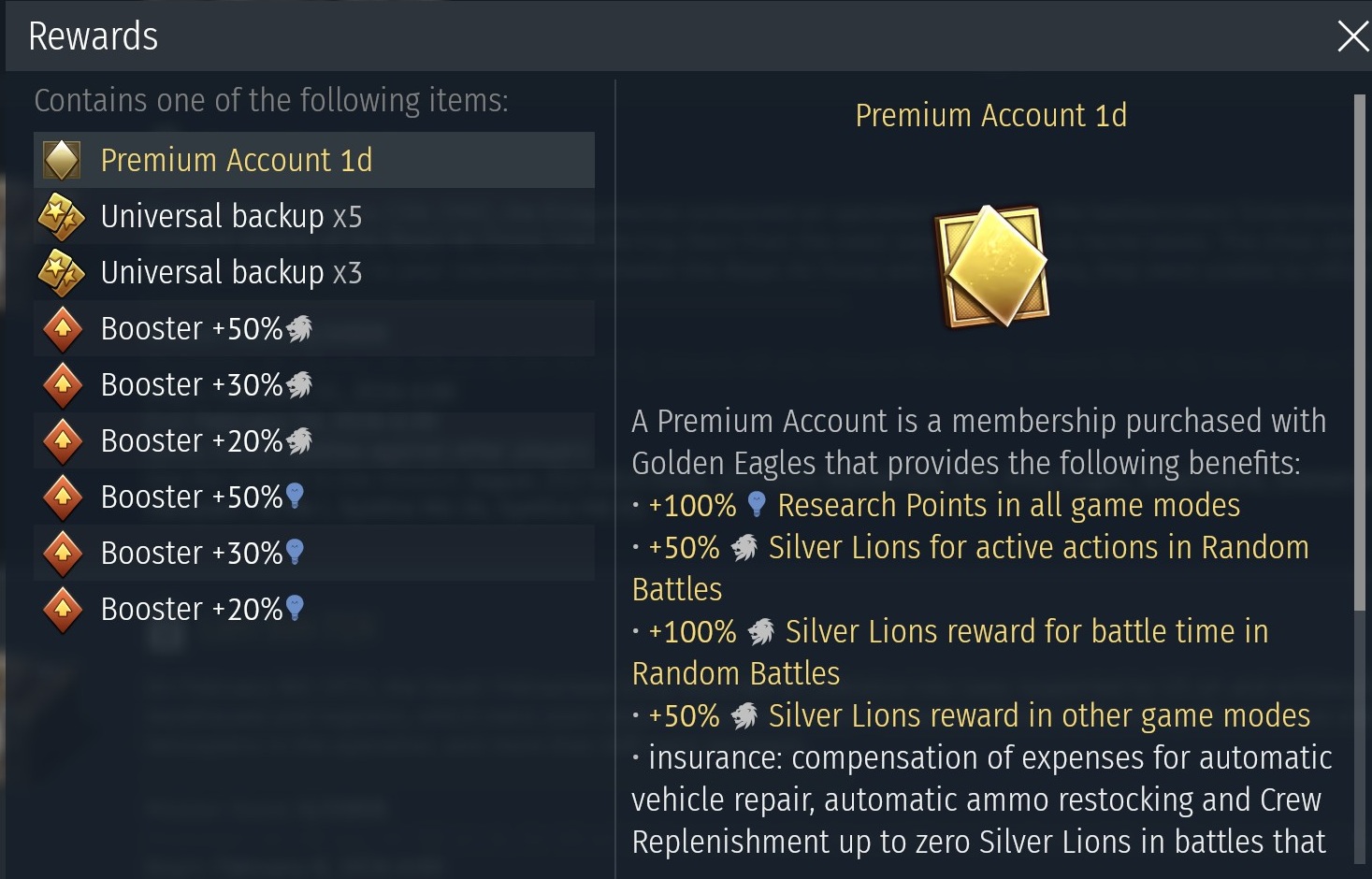 - A random ground vehicle camouflage (out of those that can currently be unlocked or purchased with Golden Eagles).