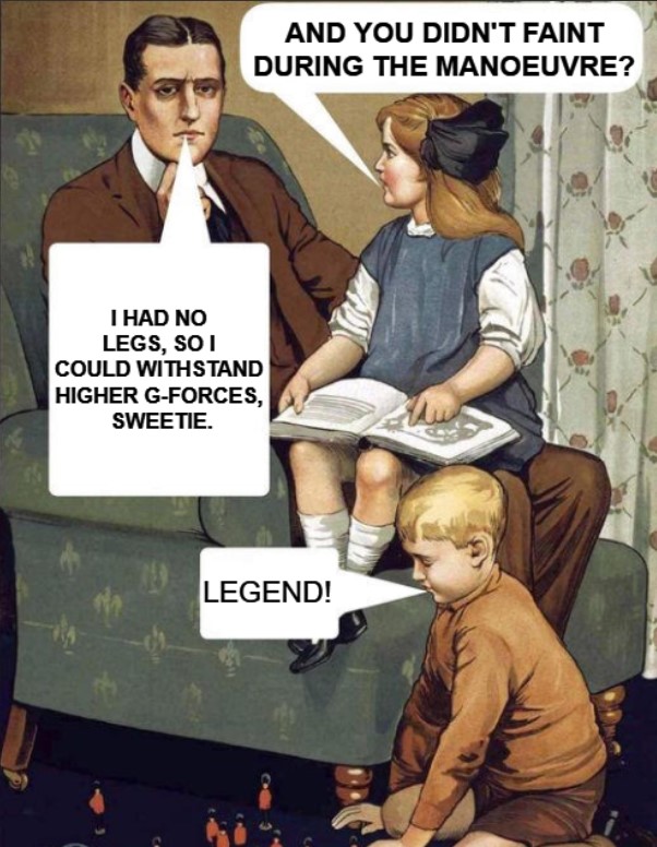 Douglas Bader was a Royal Air Force ace. In 1931, he lost both legs in an accident and was discharged, but with the outbreak of the Second World War, he returned to service. Bader participated in the Battle of Britain, flying over occupied Europe. On August 9th 1941, he was shot down over France, and while bailing out lost one of his prosthetic legs. The Germans received Bader well and even allowed British aircraft to airdrop a prosthetic leg for him. In total, Bader was credited with at least 20 air victories.