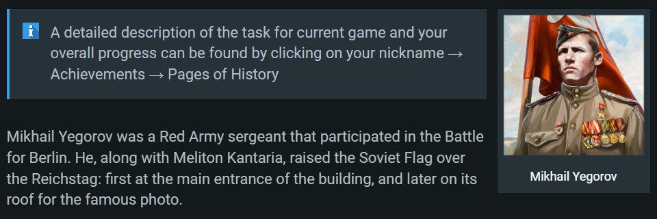 You can read a detailed description of which task is for which day and your overall progress by going to your Nickname → Achievements → Pages of History.
