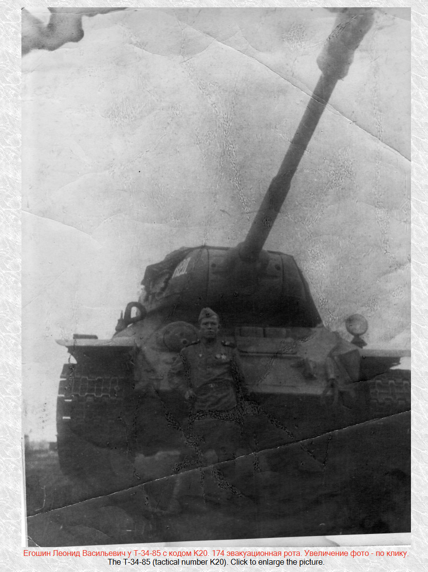 “Yegoshin Leonid Vasilyevich at the T-34-85 with code K20. 174th evacuation company.” Source:Галерея фото Т-34-85 * T-34-85 tanks photogallery