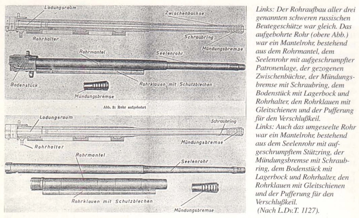 As the photos indicate, the inserted guntube most likely an Umgeseelt 85/88 mm guntube (4,930 mm) instead of that of 52-K (4,693 mm), D-5T (4,386 mm), S-53 (4,645 mm), ZiS-S-53 [improved S-53] (4,645 mm), or Aufgebohrt 85/88 mm (4,380 mm). As the new gun tube length would be the same as that of the 8.8 cm Flak 18, their ballistic performance would be identical.