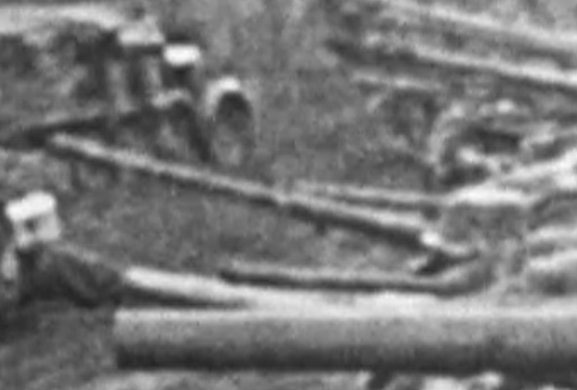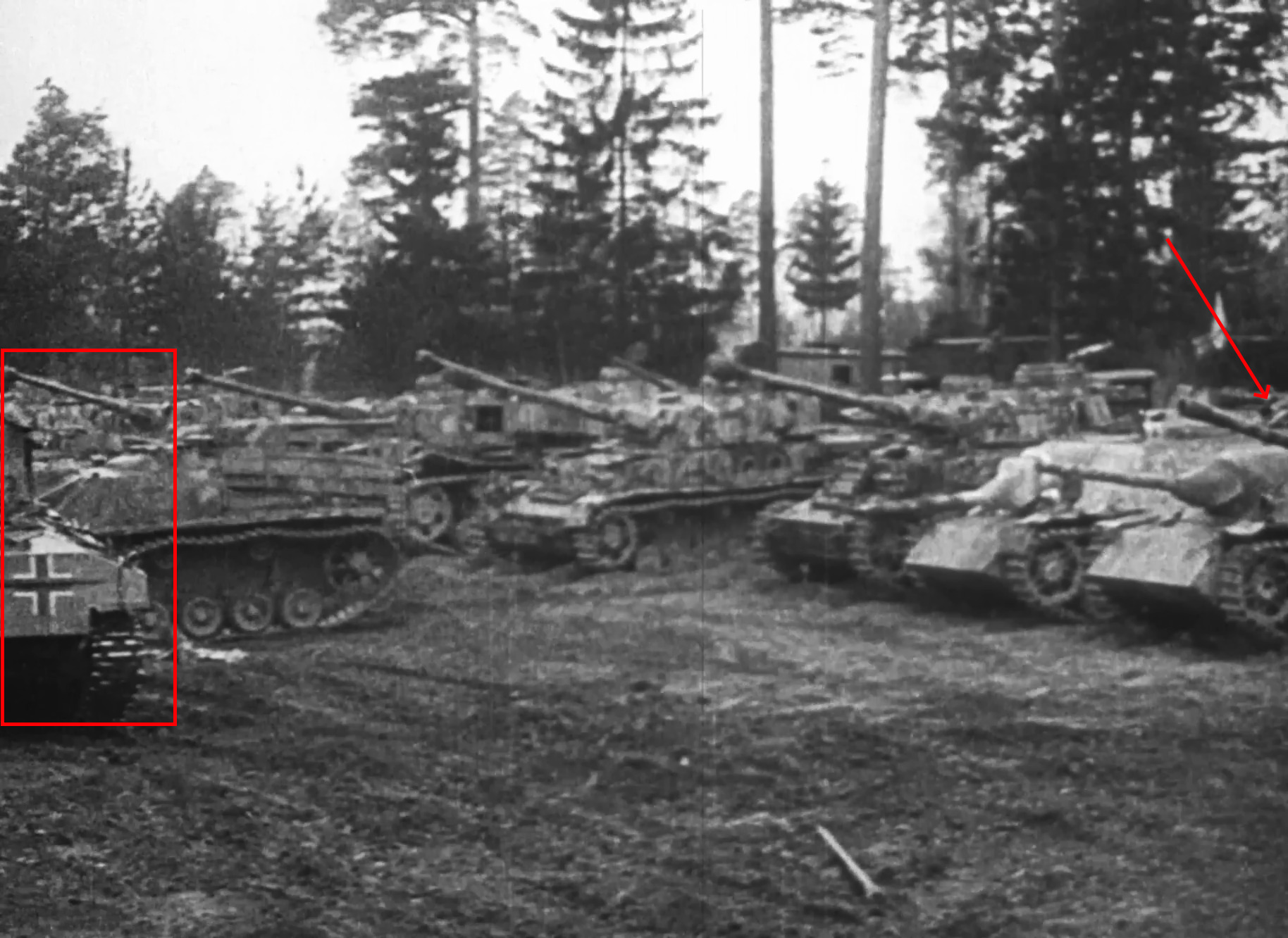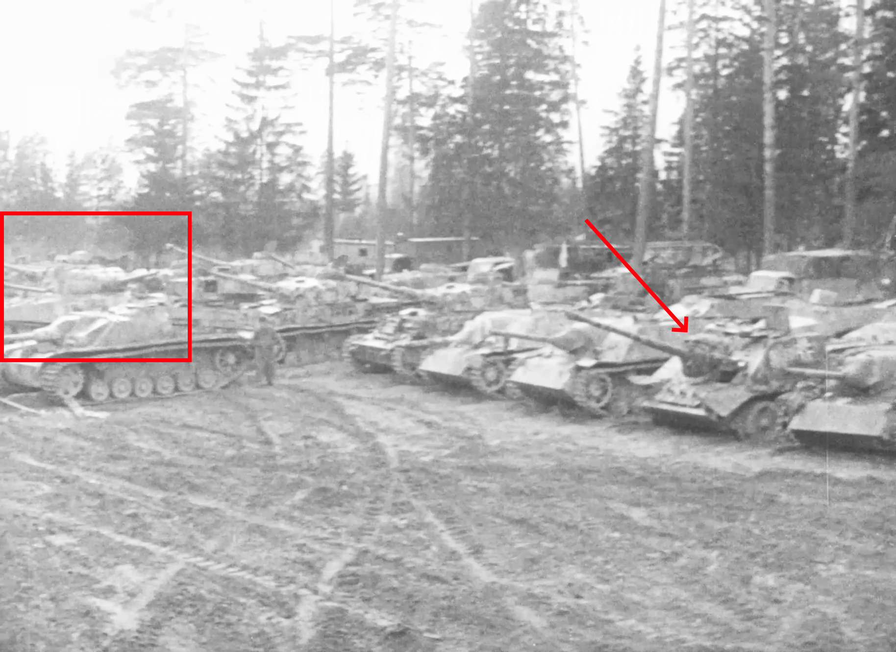 From the footage, SU-88 was painted with a German iron cross insignia, repainted with German camouflage (together with the gun), and a penetration hole is visible on the left side of the gun shield. This indicated that SU-88 was pushed and damaged in combat. Because the SU-88 has frontal bulges and a box-shaped cupola, we can tell that it was originally a SU-85 rather than a SU-85M or SU-100. Given that only the gun tube was altered, while the gun shield remained unchanged, the D-5S recoil system would most likely remain intact, but its gun breech would be bored out to fire German 88 mm shells.