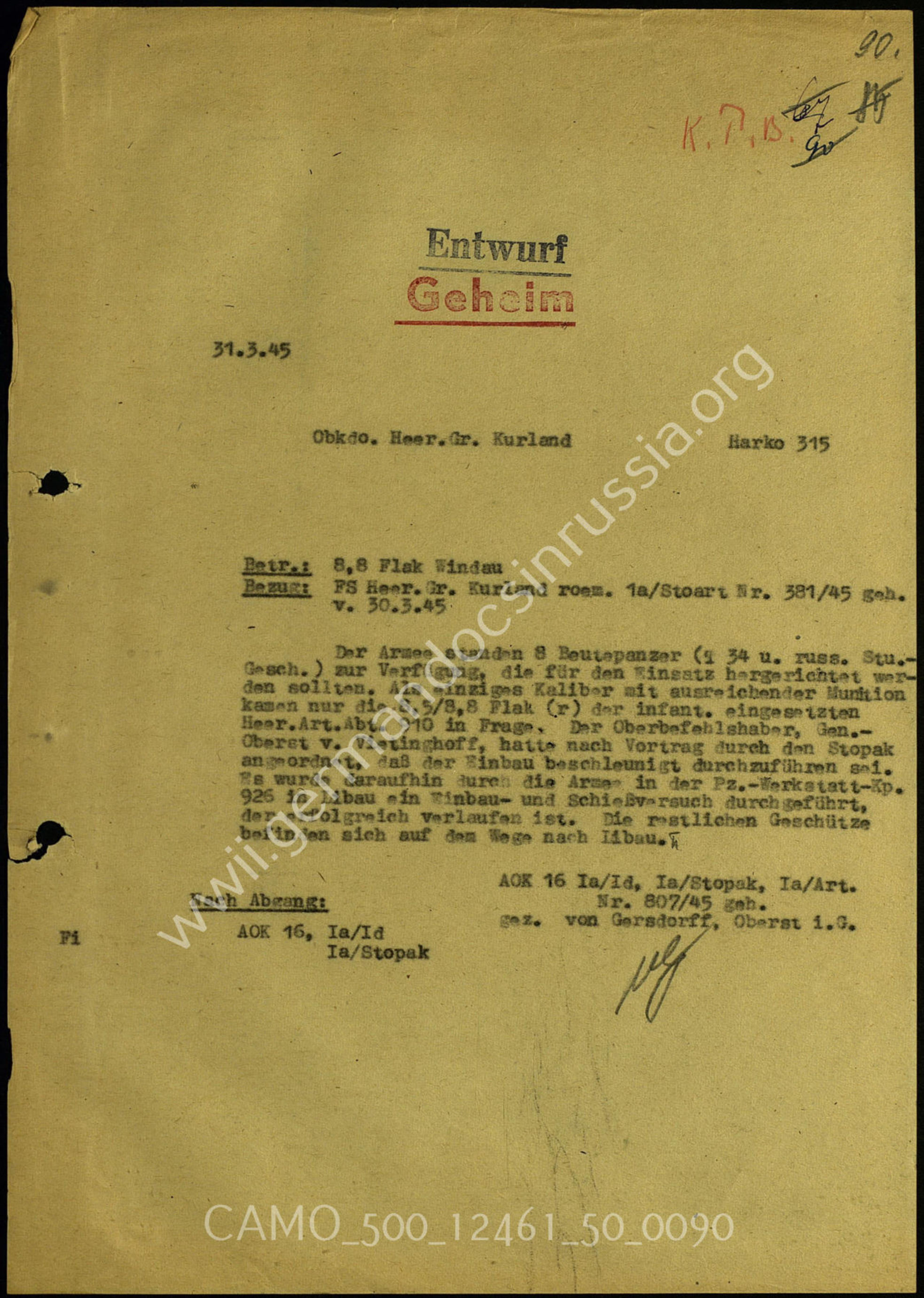 On 31 March 1945, HArko 315 sent AOK 16 a telegram titled 8.8 cm Flak Windau, stating: The army had 8 captured tanks (T-34s and a Russian assault gun) at its disposal, which were to be prepared for deployment. The only caliber for which sufficient ammunition was available was the 8.5/8.8 cm Flak (r) of Infantry-employed Army Artillery Battalion 910. The Commander-in-Chief, Colonel General von Vietinghoff, after a briefing by the anti-tank staff officer (Stopak), ordered that the installation be carried out as quickly as possible. Subsequently, the army carried out an installation and firing trial at Tank Workshop Company 925 in Libau, which was completed. The remaining guns are on their way to Libau.