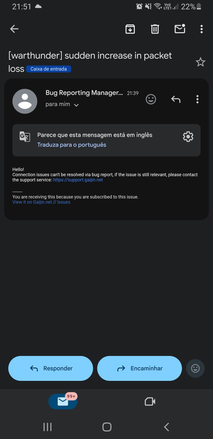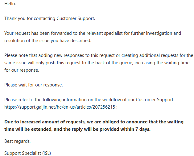 segui suas intruçoes, porem algumas horas depois recebi um email da gaijin. No email falava-se: “problemas de conexão não podem ser resolvidos por meio de relatorios”.