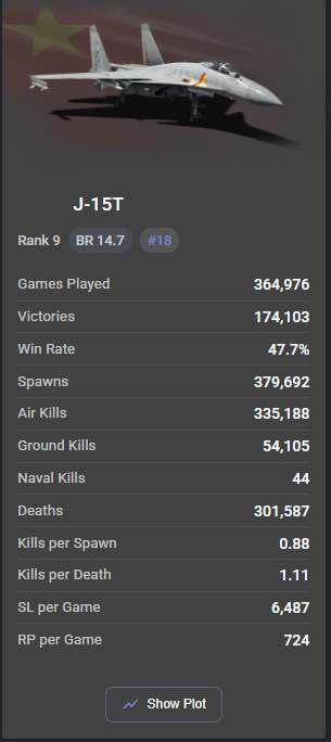 J-7D is highly oppressive at its tier with almost MiG-21bis levels of flight performance and 4x PL-5B. As it stands now, strong flareless vehicles like Mirage IIIC and F-1 are 10.0 with no flexibility to move up due to 10.7s (and to a lesser extent 10.3s) with strong missiles and ability to always get a launch angle for guaranteed kill, which J-7D is the worst offender by far. J-7D needs to move up otherwise the entire range from 9.3 to 10.7 will never see true decompression.