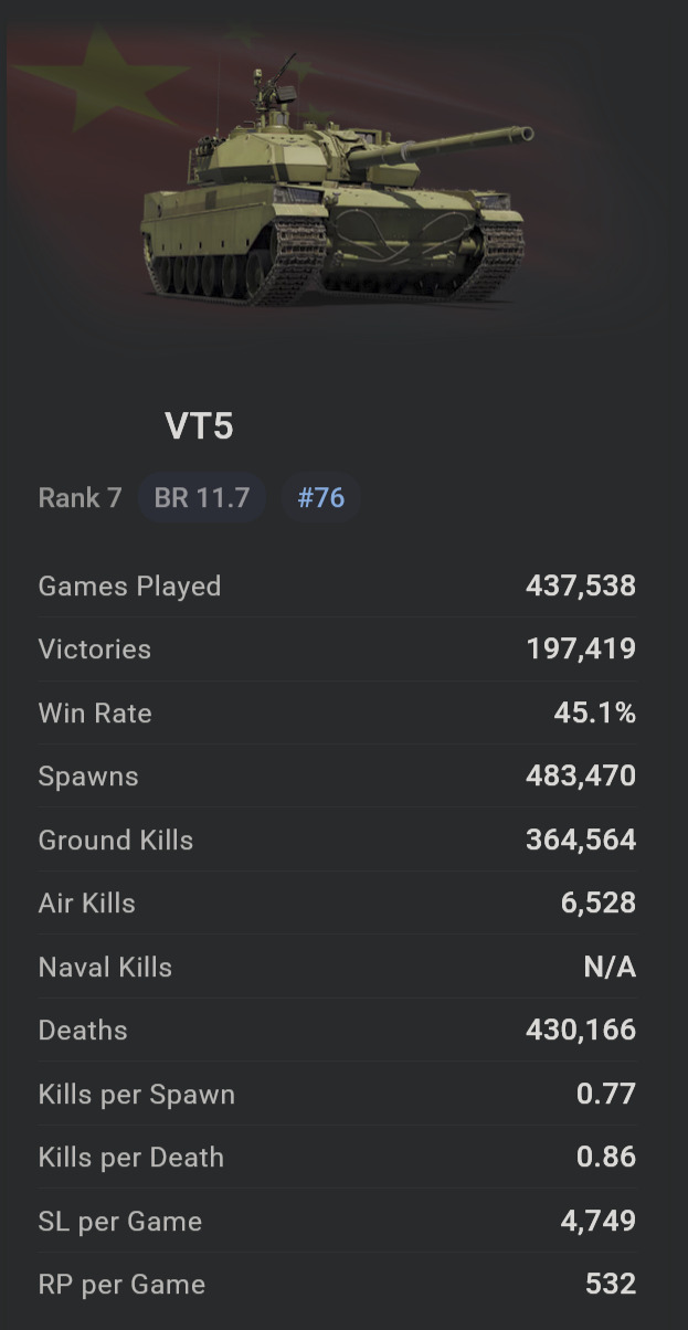 There is no reason why the VT5 should be a whole BR above something so similar, even with the higher skill level of chinese TT players the VT5 stats are not good.