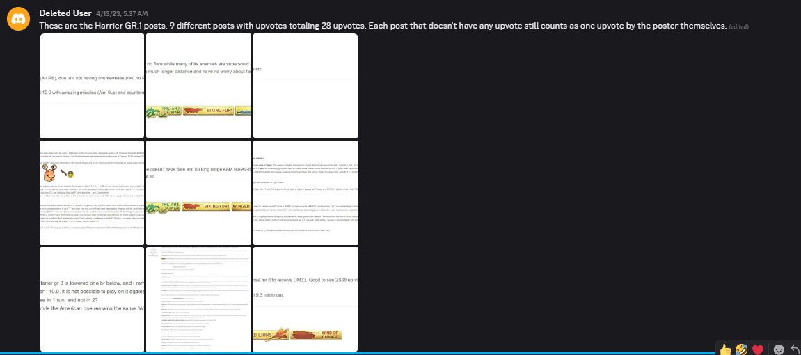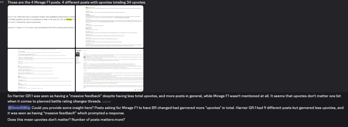 I calculated this with a previous planned br thread where Harrier GR1 had received more messages but less total upvotes, and got a developer’s response due to “massive feedback” while Mirage F1 had received less messages but more total upvotes and was completely ignored.