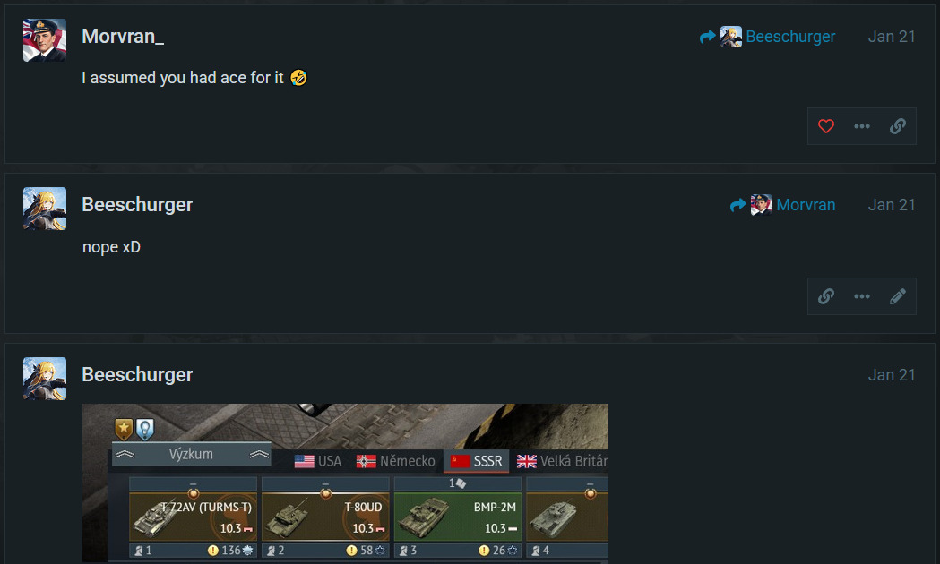 Sure, a skilled player can manage, but balance shouldn’t rely on top-tier skill to compensate for missing baseline features like thermals or decent reverse. Overexperienced player on T-80UD can kill tanks even at 12.7 battles. T-80B with thermal sight, -11km/h reverse and 1100 hp for 43 tons on 10.7 also performs well. Should it be moved to 11.0 according to this logic? What about decompression? Not moving good tanks to higher br making them less viable but lowering br for weaker tanks to make them also viable.