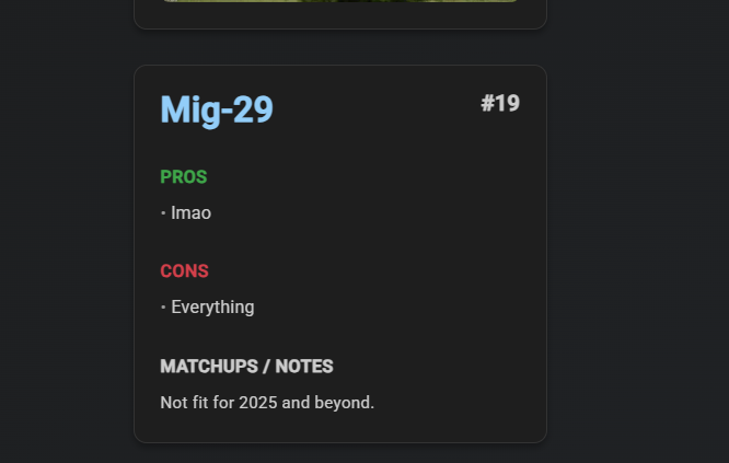 It’s really sad that all this plane does is go fast in a straight line and it only has two good missiles with the rest being nigh useless. It could get R-73 and keep the R-27ER and still be 12.7 to be honest.