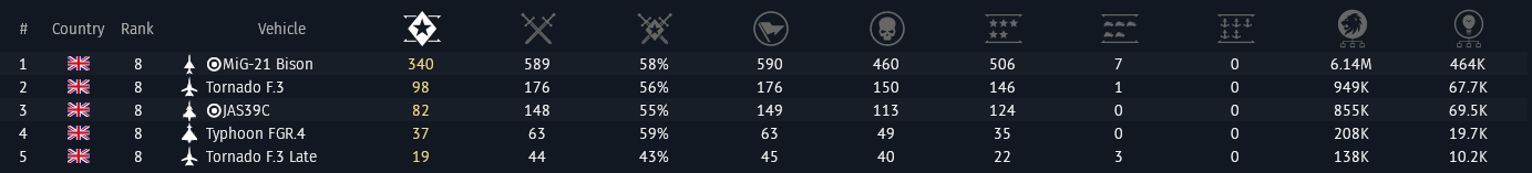 Honestly love the Tornado F.3. Once I got the Skyflash SuperTEMPs it was like the sun arose on a dark night. It has one of the strongest if not the strongest radar at 12.0 with one of the best RWRs as well and an insane amount of CMs thanks to being one of the lowest BR planes to carry BOL pods. Only problem is that it has a dogshit flight model which has been bug reported but Gaijin hasnāt accepted it and Iāve all but given up hope on the Tornados getting a decent flight model one day in the future. The last victory we had with the Tornados was when the F.3 Late went down to 13.0 from 13.3.