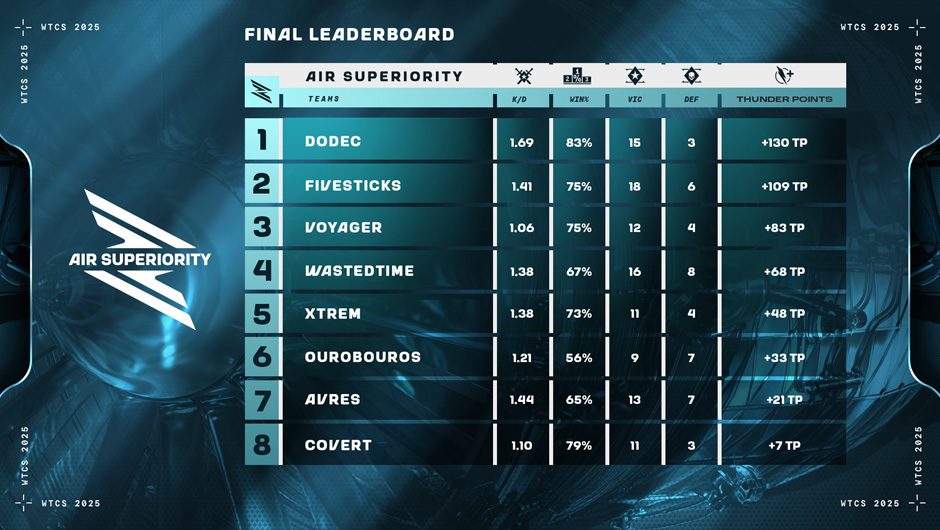 W ostatni weekend odbył się finał trzecich i ostatnich ważnych kwalifikacji do sezonu 2025 War Thunder Championships Series (WTCS). W formacie 4v4 jet zwyciężyła drużyna DODEC, która zajęła pierwsze miejsce w tabeli wyników z łączną liczbą 286 punktów Thunder!